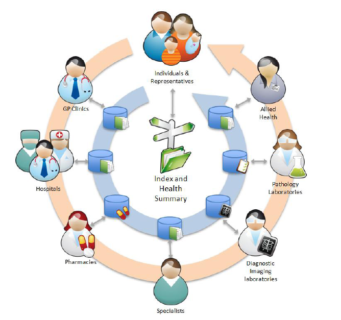 The bottom line here is that we need to address the grey before the beige on this NEHTA (from the Summit presentation) graphic! (It is fun to have the odd funny graphic to brighten things up). Let’s get the information flows between providers really working and reliable and then worry about indexes, summaries and the like.